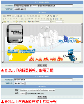 修改內容:進入修改頁面為當初建立時的編輯方式,欄位與登錄電子報相同,直接修改內容即可。 |