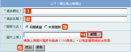 圖片上傳:若您要顯示圖片banner連結,請點選「瀏覽」上傳您的圖片;若您只想要在前台顯示連結文字,可忽略此選項。 |