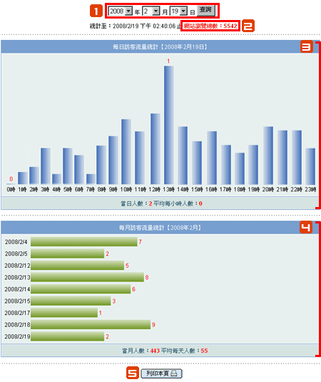 每日流量統計:一日流量﹝分24小時﹞,以長條圖顯示,下方有當日總人數及平均每小時人數。 |