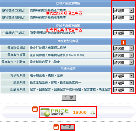 「商城昇級優惠專區」通常為最優惠的組合,讓您用經濟實惠的價錢買到較齊全的功能。此處顯示內容會依造您申請的網站性質(購物商城/企業網站)而不同。 |