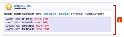 選購功能即將到期前一個月,會顯示於後台首頁「選購系統公告」中,提醒您是否要續訂該功能。 |